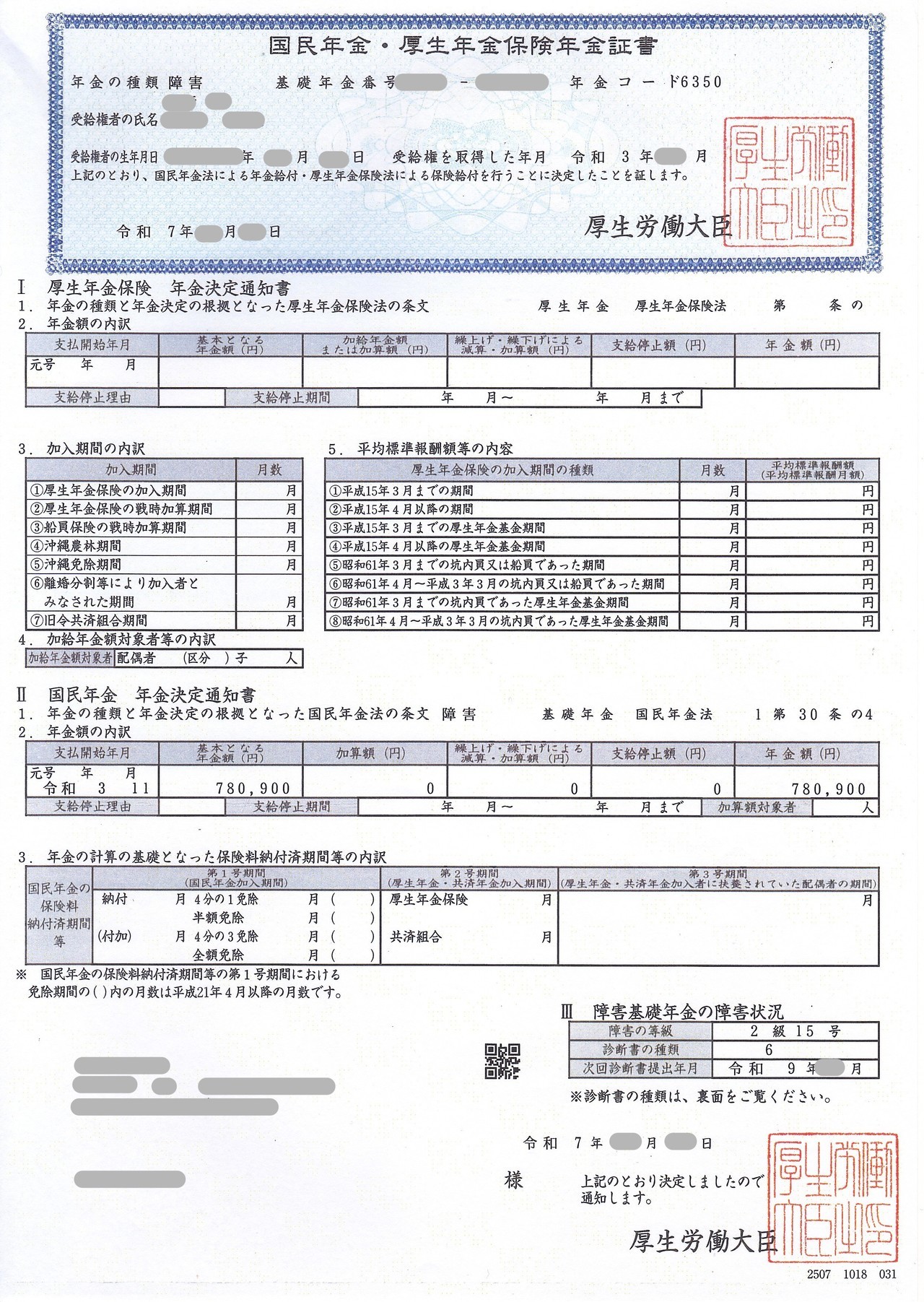 審査機関からの照会等もなく、申請から約2カ月で、遡及分、請求月以降分共、障害基礎年金2級にて支給決定されました(2年更新)。